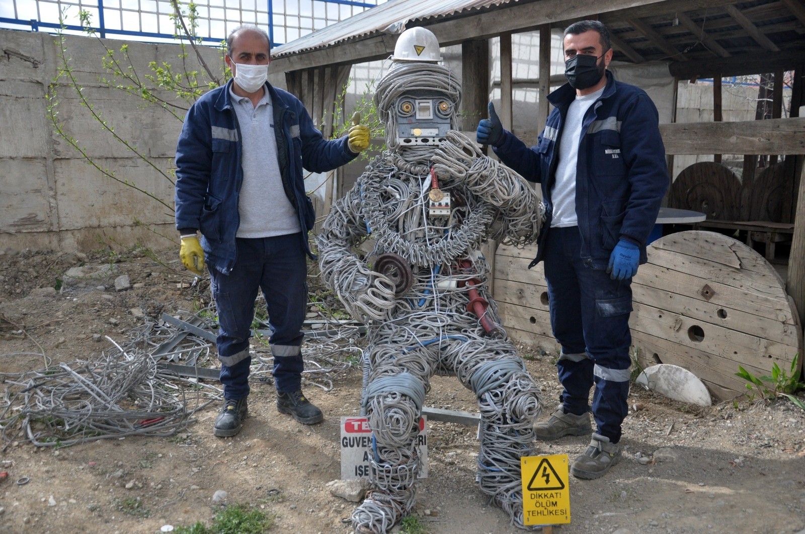 Hakkari’nin Yüksekova ilçendeki Vangölü Elektrik Dağıtım A.Ş. (VEDAŞ) arıza servisinde çalışan Sabri Akdoğan ve Fikret Öztunç, atık malzemeleri sanata dönüştürerek ‘tel adam’ yaptı.