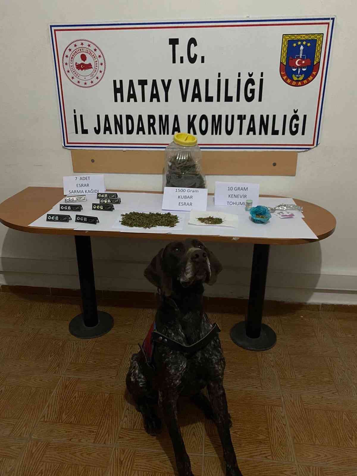 Hatay’ın Hassa ilçesinde bir evde yapılan aramada 1 kilo 500 gram esrar ele geçirildi. İlçe Jandarma Komutanlığı tarafından yürütülen kaçakçılıkla mücadele kapsamında, Aşağıkarafakılı Mahallesinde E.T. isimli şahsın evinde uyuşturucu madde bulundurduğu bilgisine ulaşıldı. Uyuşturucu madde arama köpeği "Tonaj" ile birlikte evde yapılan aramada 1 kilo 500 gram kubar esrar maddesi ile 10 gram kenevir tohumu ele geçirildi. Gözaltına alınarak adli makamlara sevk edilen şüpheli şahıs E.T. adli kontrol şartıyla serbest bırakıldı.