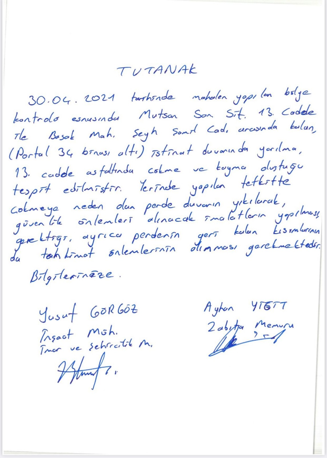“Başakşehir Belediyesi saha kontrol ekiplerimiz tarafından 30.04.2021 tarihinde yapılan denetimler sırasında 13. Cadde ile Şeyh Şamil caddesi kesişiminde ve İOSB sorumluluğunda bulunan alanda istinat duvarlarında EK1 fotoğraflarda görüldüğü üzere ayrılma tespit edilmiş, Ek2 tutanak ile imza altına alınmıştır. Fen İşleri ekiplerimiz tarafından 24 saat içerisinde Şeyh Şamil Caddesi tek yönlü olarak trafiğe kapatılmış, yönlendirme - güvenlik önlemleri alınmış, atıksu ve yağmursuyu bacalarının deplasesi yapılmış ve kontrollü yıkıma başlanmıştır. Yaklaşık 120 metrelik duvarın, 34 metrelik hareket eden anosu yıkılmış olup, henüz hareketi başlamamış diğer anolar için günlük deformasyon ölçümleri yapılarak hareketi izlenmiştir. Sonrasında ekiplerimiz tarafından 34 metrelik duvar için kazık ve perde projeleri hazırlanmış, kazıkları tamamlanmış ve temel demirleri bağlanmıştır. Kırım ve kazı sırasında 7 metre yüksekliğinde perdenin yeterli donatıya sahip olmadığı, perde altında herhangi bir kazık imalatı yapılmadığı, perde arkasında drenaj bulunmadığı ve niteliksiz malzeme ile dolgu yapıldığı tespit edilmiştir. Diğer duvarlar için tamamen yıkılıp yeniden yapılmadan zemin çivisi yöntemi ile güçlendirme projeleri üzerine çalışırken, bir anoda hareket tespit 2 cm hareket tespit edildi. Bu hareket haziran başında 4 santimetre ve sonrasında 7 santimetre oldu. Bu hareket sonrasında perdenin güçlendirilmesinden vazgeçilerek, yıkılarak yenilenmesine karar verildi. Yeniden yapım projeleri başlatıldı, devrilme ihtimaline karşı arka kısmına topuk malzeme serildi ve kazı yapılabilmesi için perde üzerindeki atıksu ve yağmursuyu hatlarının deplase çalışmaları başlatıldı. Bu durum 11.06.2021 tarihinde yazımız ekindeki resmi yazı ile İOSB Başkanlığına bildirilmiştir. 18.06.2021 tarihinde yağan şiddetli yağmurlar sonrasında perde devrildi, alınan güvenlik önlemleri neticesinde üzücü bir olay yaşanmamıştır.”