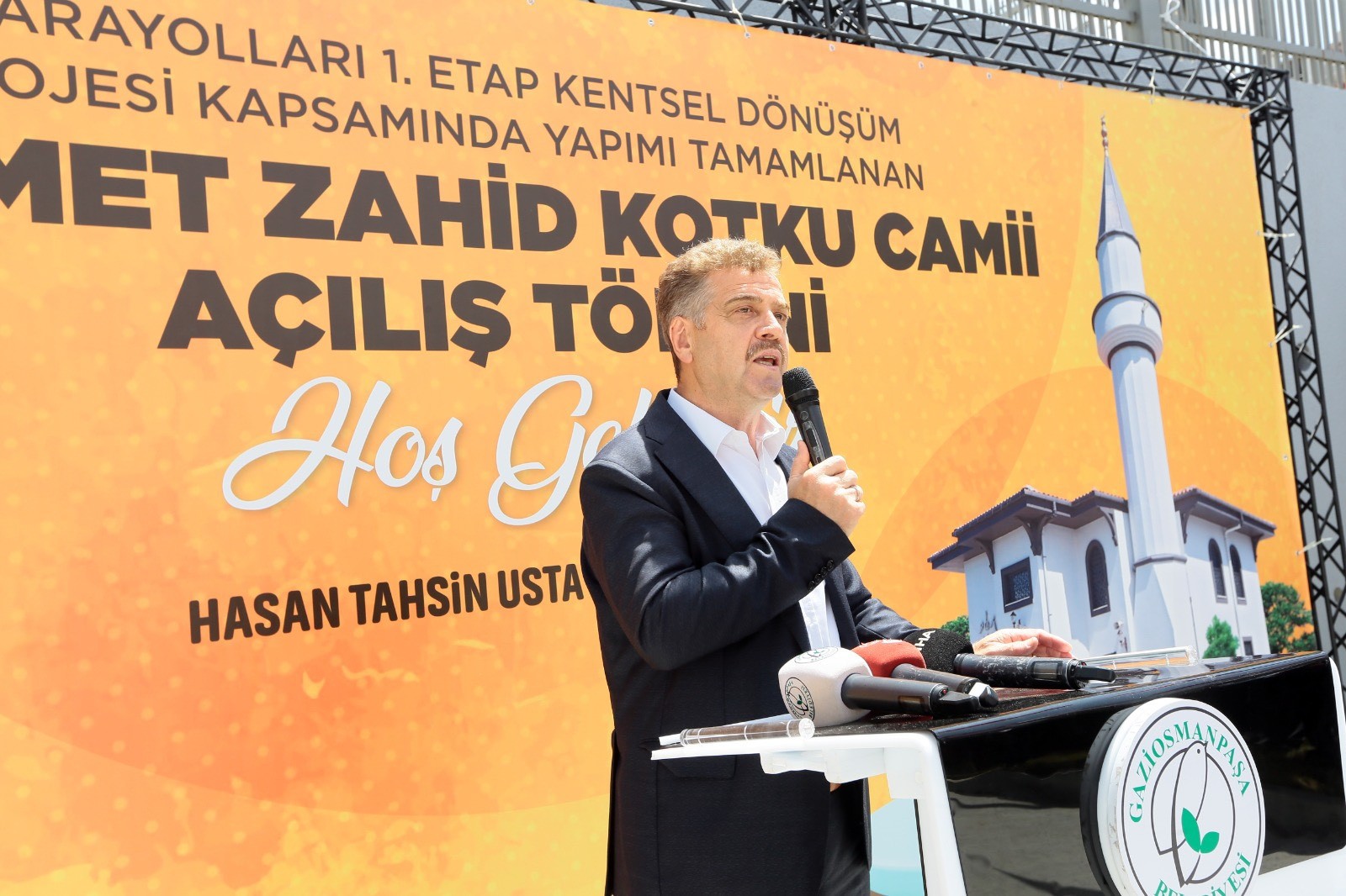 Şehirlerde yaşamın zorlaştığını söyleyen Gaziosmanpaşa Belediye Başkanı Hasan Tahsin Usta, “Camimiz hayırlı olsun. Şehirlerde yaşam zorlaşınca camii yapma alanları da oldukça zor oluyor. Kentsel dönüşüm çalışmaları kapsamında hedefimiz her bölgede sosyal donatıların tamamını da yerine getirirken okul, cami, spor salonu ve otopark sorununu bu projede çözmek. Bu projede örnek bir projedir. Camimiz baktığınız zaman çok küçük gibi görünüyor ama biz cami konseptlerini şehrimizde değiştiriyoruz. Büyük camiler yapıyoruz içi boş cemaatler geliyor. Küçük cami yapıyoruz bereketli cemaatlerle namaz kılıyoruz. Büyük camileri yapmak bir maliyet, işletmek ikinci maliyet, temizlemek üçüncü maliyet, bakım onarımı dördüncü bir maliyet ve cemaat yok beşinci maliyet. Küçük camileri sokak başlarına uygun alanlara daha güzel modern mimarilerle insanların gelişimini kolaylaştırmaktır. Yani daha küçük camilerde daha sohbet bari ibadet yapma imkanı sunmak istiyoruz. Şehrimize 5 tane caminin ibadete açılmasını sağlayacağız” dedi.