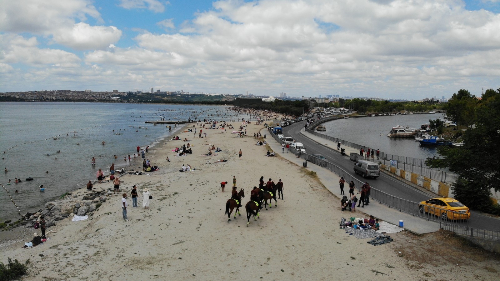 Küçükçekmece’de, Kurban Bayramı tatilinde bir yere gidemeyen birçok yerli ve yabancı turist, soluğu Menekşe Plajı’nda aldı. Plajlarda yaşanan yoğunluk nedeniyle Küçükçekmece İlçe Emniyet Müdürlüğüne bağlı ekipler drone ile denetimler gerçekleştirerek pandemi kurallarına uyulması gerektiğini hatırlattı.