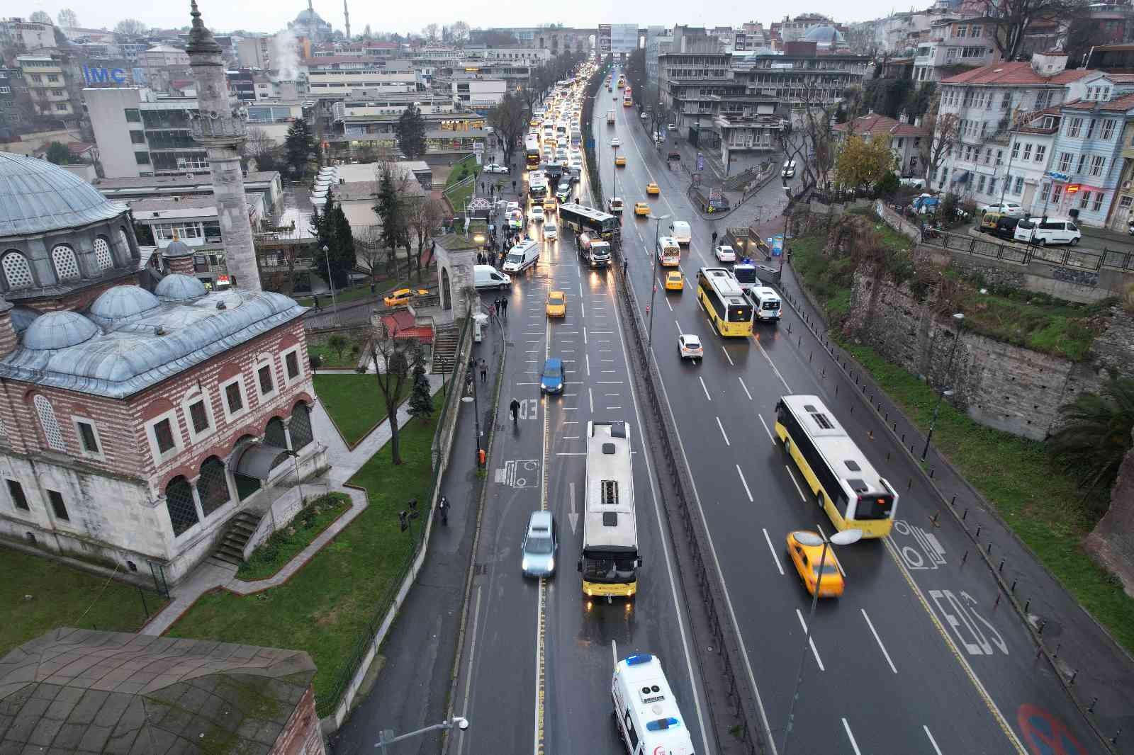 Fatih Unkapanı’nda 2 İETT otobüsü çarpıştı. İETT otobüslerinden biri refüje çarparak durabilirken kazada 8 kişi yaralandı. Kaza nedeniyle oluşan uzun araç kuyrukları drone ile görüntülendi.