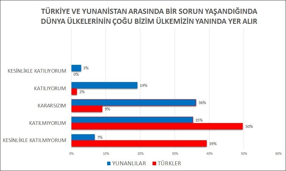 "Örneğin; birçok platformda dillendirilen ’Toplumlar arasında sorun yoktur, sorunları üreten siyaset kurumudur’ yaklaşımı her iki ülke halkından da çok büyük oranda kabul görmekte. Bu önermeye Yunanlıların yüzde 44’ü Türklerin ise yüzde 42’si ’Kesinlikle katılıyorum’, Yunanlıların yüzde 38’i ’Katılıyorum’, Türklerin ise yüzde 39’ü katılıyorum yanıtını verdi. Kesinlikle katılmadığını ifade edenlerin oranı her iki ülkede de yüzde 2’ olurken, ’Katılmıyorum’ diyen Yunanlıların oranı yüzde 5, Türklerin ise yüzde 7. Kararsız olduğunu beyan eden Yunanlılar araştırmaya katılanların yüzde 11’ini oluştururken, bu oran Türklerde yüzde 10; yani bu sonuçlar ışığında, her iki toplumun da, çok belirgin bir şekilde, halkların arasında sorun olmadığını düşündüğünü söyleyebiliriz."