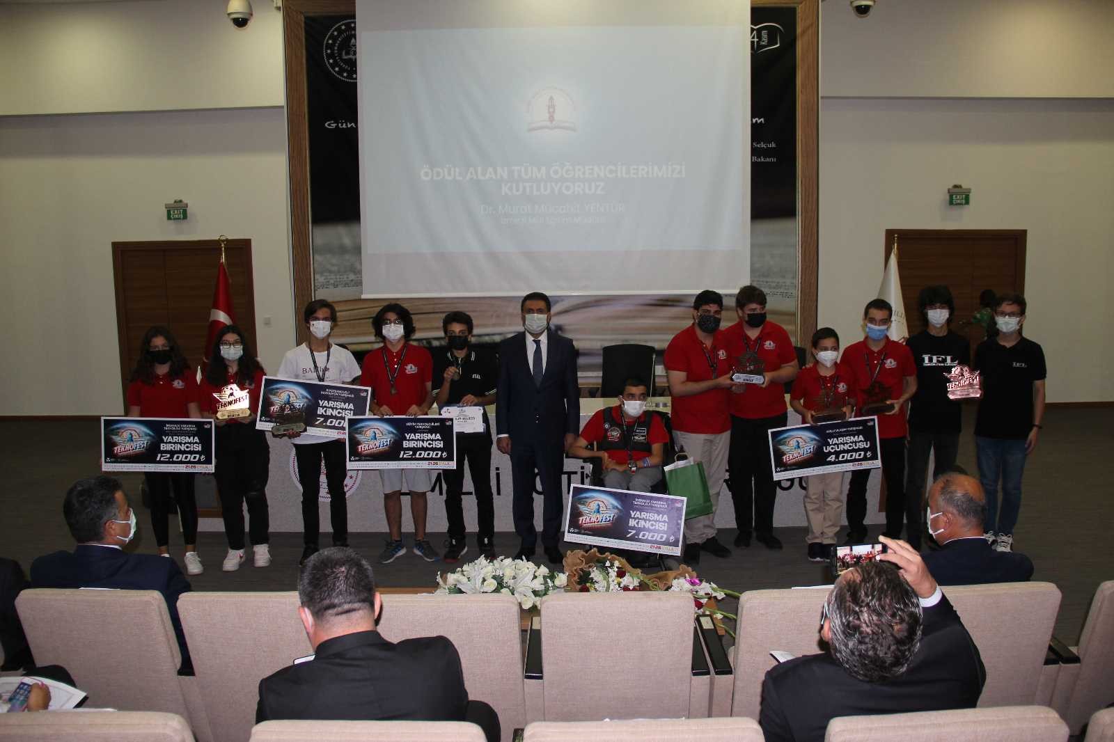 Türkiye’nin en önemli bilim ve teknoloji festivali olan TEKNOFEST 2021’de adeta İzmir rüzgarı esti. Fatma Saygın Anadolu Lisesi öğrencisi Murat Işık, ’Biyoteknoloji Yarışması’nda Türkiye 1.’si; Arkas Bilim ve Sanat Merkezi öğrencileri Bade Bereketoğlu, Ayşe Özdemir ve Barkın Özsoy, ’İnsanlık Yararına Teknoloji Yarışması Afet Yönetimi Kategorisi’nde Türkiye 1.’si; Özel Dünya Fen Lisesi öğrencisi Mert Delibalta, “Eğitim Teknolojileri Yarışması”nda Türkiye 1.’si; Bornova Anadolu Lisesi öğrencisi Can Baki, ’Lise Fikir Yarışması’nda Türkiye 2.’si; Seferihisar Semiha - İrfan Çalı Mesleki ve Teknik Anadolu Lisesi öğrencileri Ege Katmerci, Yiğit Aliyev ve Efe Bilir, ’İnsan Yararına Engelli Dostu Katogerisi’nde Türkiye 2.’si; Özel Gaziemir Uğur Ortaokulu öğrencisi Barkın Özsoy, ’Akıllı Ulaşım Yarışması’nda Türkiye 3.sü ve Arkas Bilim ve Sanat Merkezi öğrencisi Artun Özsoy, ’Lise Öğrencileri Kutup Araştırma Projeleri Kategorisi’nde Türkiye 3.’sü oldu. Bornova İzmir Fen Lisesi öğrencileri Alperen Tupurtu ve Ahmet Taha Kalıbcı da, ’Sağlıkta Yapay Zeka Yarışması’nda ’En İyi Sunum Ödülü’nün sahibi oldu. Ödül törenine, öğrenciler ve aileleri ile birlikte, ilçe müdürleri ve danışman öğretmenler Sertaç Ateş, Selçuk Sağbaş, Mustafa Arbay, Benginur Tenkılıç, Bora Cemal Özdemir, Zeynep Deniz Koçal, Ferit Avcı ve Hüseyin Taşatan da katıldı.