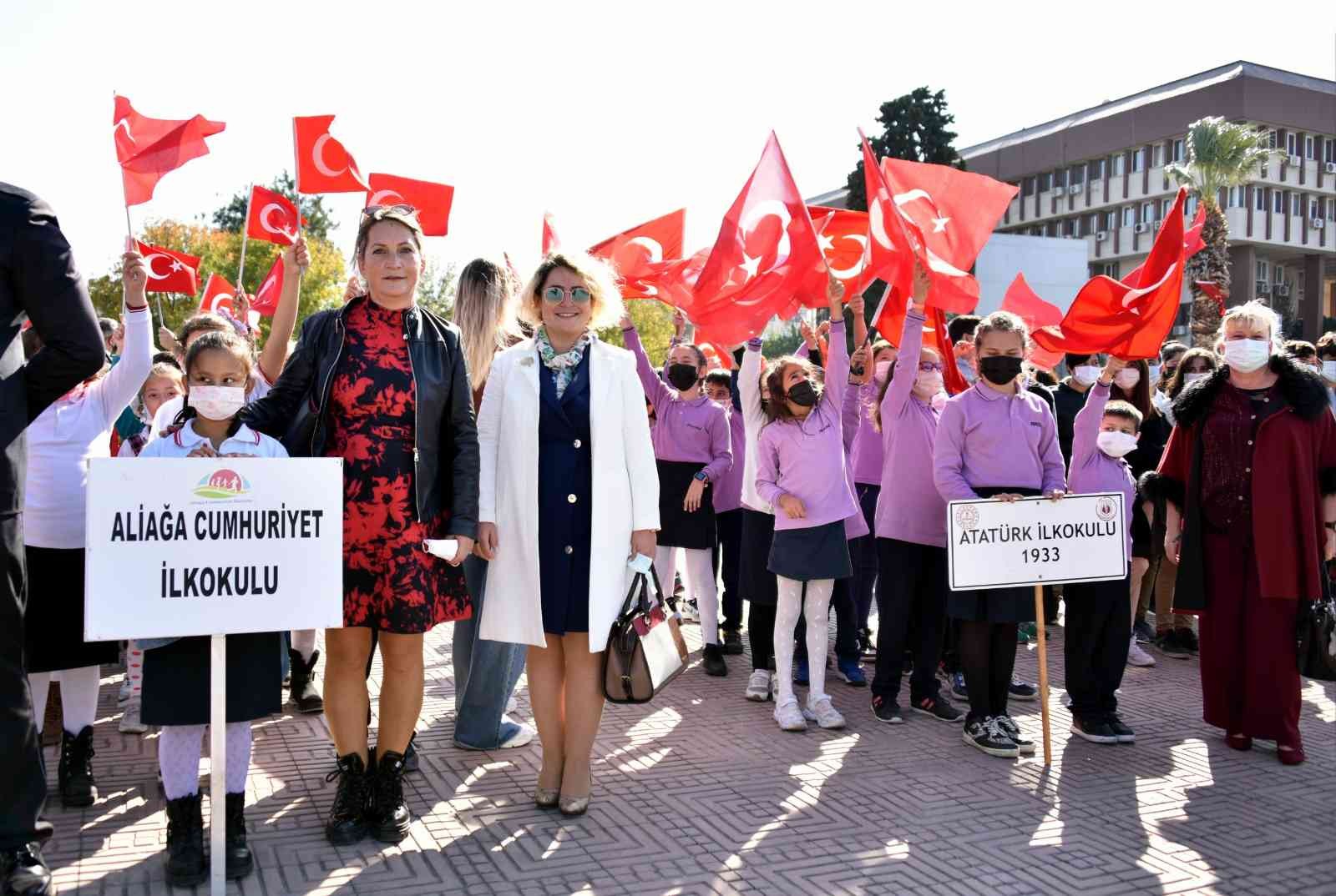 Cumhuriyet Meydanı’nda gerçekleştirilen törene Aliağa Kaymakamı Ömer Karaman, Aliağa Belediye Başkanı Serkan Acar, Garnizon Komutanı Albay Faruk Altun, kurum müdürleri, askeri erkan, siyasi parti temsilcileri, sivil toplum kuruluşları, şehit aileleri, gaziler, öğretmenler, öğrenciler ve vatandaşlar katıldı. Törende, Aliağa Kaymakamı Ömer Karaman, Aliağa Belediye Başkanı Serkan Acar ve Garnizon Komutanı Albay Faruk Altun Atatürk Anıtına çelenk sunumlarını gerçekleştirdi. Çelenk sunumlarının ardından saygı duruşunda bulunuldu ve İstiklal Marşı hep bir ağızdan okundu. Cumhuriyet Bayramı resmi programı Aliağa Kabristanlığında bulunan şehitlik ziyareti ile son buldu.