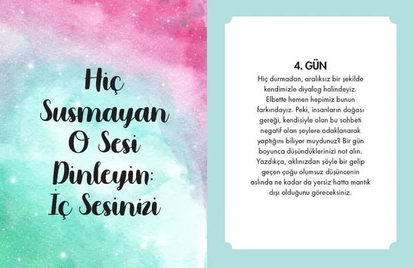 21 günde, 21 adımda farkındalığınızı artırıp, kendinizin daha iyi bir versiyonu olma fikri kulağa nasıl geliyor? Muhteşem mi? Yoksa kesinlikle imkansız mı? İşte Cosmopolitan'ın hediyesi 21 karttan oluşan bu program kendinizin daha iyi bir versiyonu olmanıza yardımcı olmak için uzmanların yönlendirmeleriyle hazırlandı. Kim olursanız olun; farkındalık çalışmalarıyla, egzersiz rutinleriyle, beslenme düzenleriyle ilişkiniz ne seviyede olursa olsun bu kartlardan faydalanabilirsiniz.