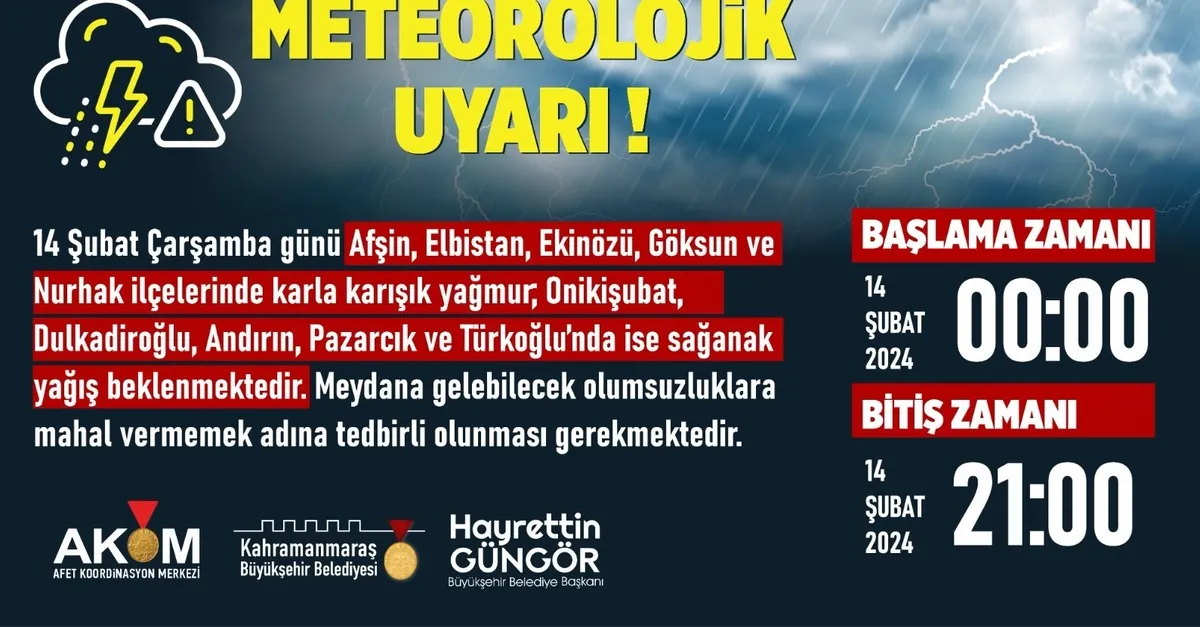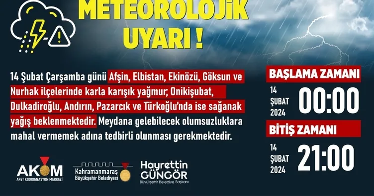 Kahramanmaraş Büyükşehir Belediyesi Afet Koordinasyon Merkezi (AKOM), 14 Şubat Çarşamba günü Afşin, Elbistan, Ekinözü, Göksun ve Nurhak ilçelerinde karla karışık yağmur; Onikişubat, Dulkadiroğlu, Andırın, Pazarcık ve Türkoğlu'nda ise sağanak yağış beklendiğini duyurdu.