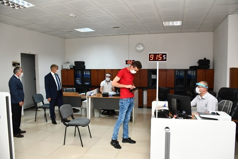 Merkez İlçe Nüfus Müdürlüğünde çalışan personeller ve vatandaşlar için Covid-19 salgını için alınan tedbirleri inceleyen Vali Gürel, İl Nüfus ve Vatandaşlık Müdür Hasan Kahraman ile Merkez İlçe Nüfus Müdürü Mevlüt Koca’dan pasaport, sürücü belgesi ve kimlik kartı işlemleri başta olmak üzere yürütülen iş ve işlemler hakkında bilgi aldı.