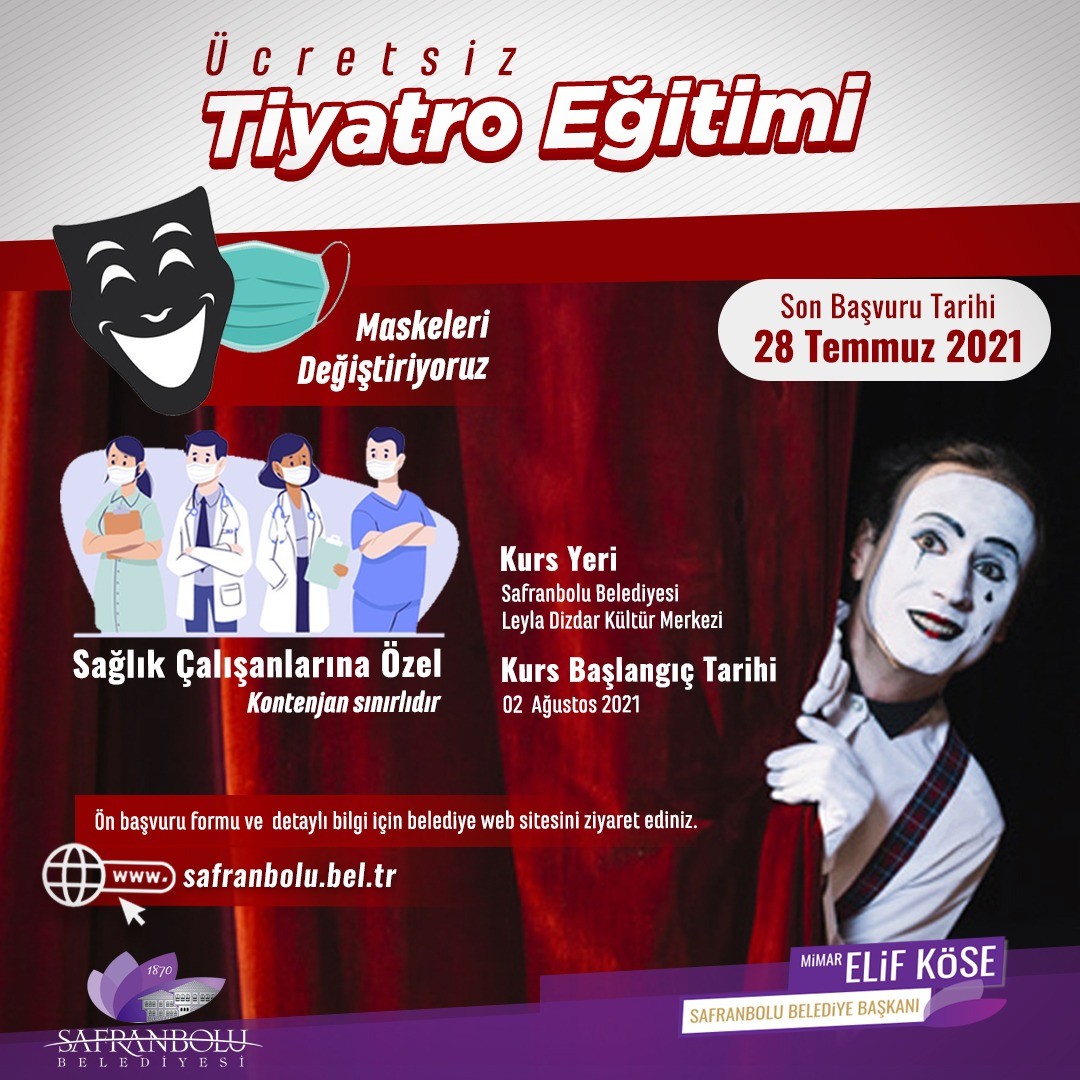 Safranbolu Belediyesi Kültür ve Sosyal İşleri Müdürlüğü tarafından çocuk ve gençleri sanatsal, kültürel aktivitelere yönlendirmek ve becerilerini ortaya çıkarmak amacıyla açılacak olan tiyatro kursları için ön kayıtlar başladı.Safranbolu Belediyesi web sayfasından ulaşılabilecek olan kurs kayıt formlarının eksiksiz doldurulması istenirken, sağlık çalışanlarına özel kontenjan ayrıldı.Konu ile ilgili bir açıklama yapan Safranbolu Belediye Başkanı Elif Köse; “ Safranbolu Belediyesi olarak rutin çalışmalarımızın yanı sıra, bir kültür kenti olarak yine kültürel faaliyetlerine de önem veriyoruz. Bu kapsamda gerçekleştirdiğimizi faaliyetlere tiyatro eğitimini de ekledik...