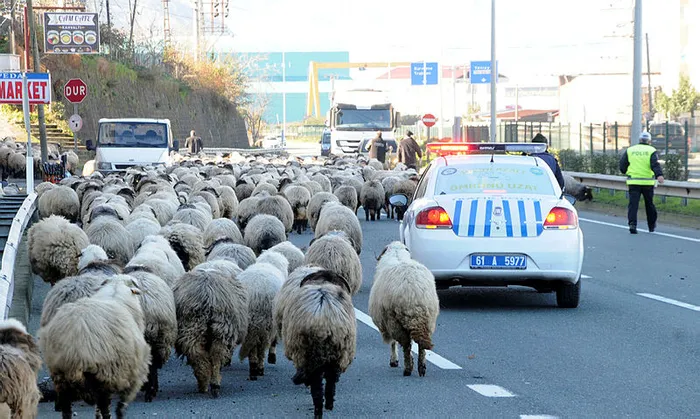 Koyun sürülerinin geçtiği Karadeniz Sahil Yolu'nda, zaman zaman trafik olumsuz yönde etkiledi. Trafik polislerinin eskortluk yaptığı sürü, sürücülerin şaşkın bakışları altında yoluna devam etti. Sürüye eşlik eden polis ekipleri araçları dikkatli seyretmeleri konusunda uyardı. Çoban Tayyip Kurt, Of İlçesi'nden gelip Arsin İlçesi'ne gittiğini belirterek,