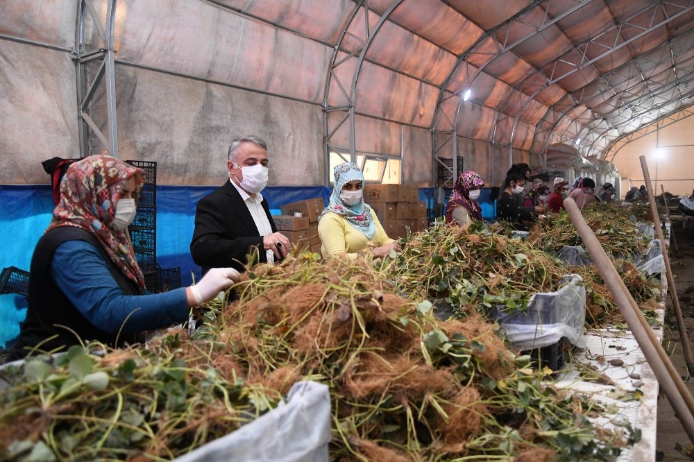 Kayseri Tarım ve Orman İl Müdürü Mustafa Şahin, Bitkisel Üretim ve Bitki Sağlığı Şube Müdürü Mehmet Demirbaş ile birlikte Develi ilçesi Soysallı Mahallesi’nde bulunan çilek fidesi üretim firmasına ait fide üretim parsellerini gezdi.
