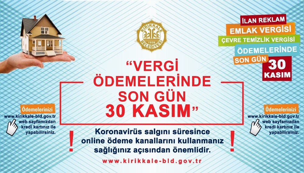 Her yıl mayıs ve kasım aylarında olmak üzere iki eşit taksitte ödenen konut ve işyerlerine ait emlak ve çevre temizlik vergisi ile işyerlerinin ilan ve reklam vergisi 2020 yılı ikinci taksiti ödemeleri 30 Kasım Pazartesi günü mesai bitimine kadar yapılabilecek. Vatandaşlar ödemelerini TC kimlik numarası veya sicil numarası ile Kırıkkale Belediyesi vezneleri ile yine belediyenin internet sayfası üzerinden ve mobil uygulama aracılığıyla gerçekleştirebilecek.