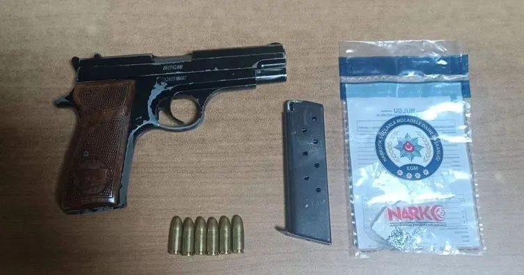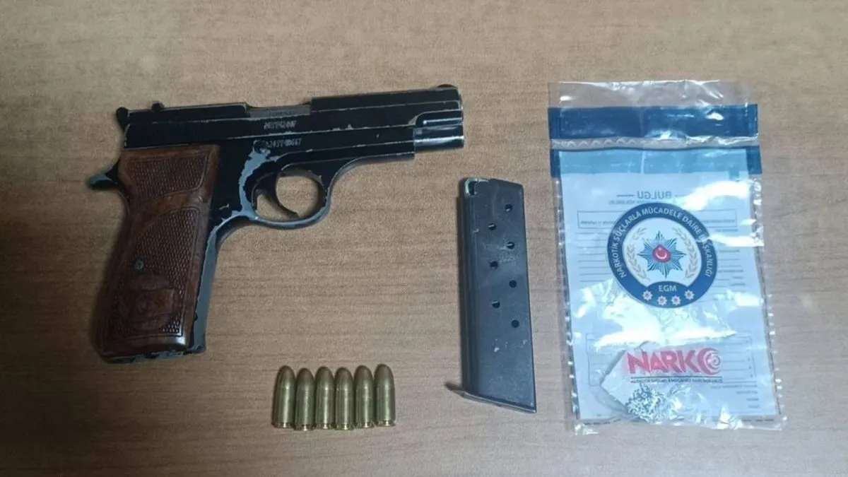 Bir iş yerinde şüpheli hareketler sergileyen B.K.'nın üzerinde bir ruhsatsız silah, altı mermi ve 0,59 gram kısaca "MET" olarak adlandırılan Metamfetamin isimli uyuşturucu madde bulundu. B.K. gözaltına alındı. El konulan suç unsurları incelemeye alındı.