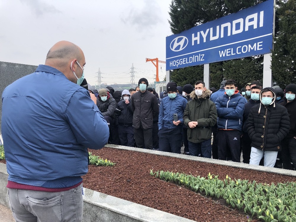 Kocaeli’de bulunan Hyundai Assan fabrikasında yapılan toplu sözleşme görüşmelerinde teklif edilen yüzde 14’lük zammı kabul etmeyen işçiler, mesai sonunda servis araçlarına binmeyerek fabrika girişinde eylem yaptı.