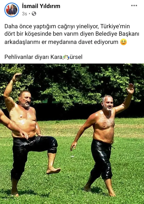 Efsane Kırkpınar Başpehlivanı Ahmet Taşçı ile antreman esnasında çekilen fotoğrafını "Daha önce yaptığım çağrıyı yineliyor, Türkiye'min dört bir köşesinde ben varım diyen belediye başkanı arkadaşlarımı, er meydanına davet ediyorum" ifadelerini kullandı ve altına 'Pehlivanlar diyarı Karamürsel' yazarak paylaştı.