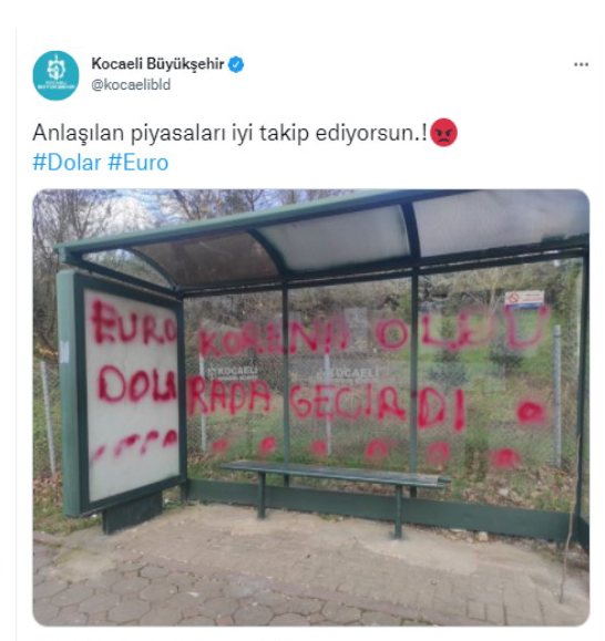 Belediye ekipleri, bir yandan durağın temizlenerek eski haline getirilmesi amacıyla, bölgeye ekip gönderirken, diğer yandan sosyal medya hesabından durağa " Euro korona oldu, Dolara da geçirdi" ifadelerini yazan kişi yâda kişilere göndermede bulunarak, " Anlaşılan piyasaları iyi takip ediyorsun" yazıp kızgın surat ifadesi ile sosyal medya hesabından paylaştı. Paylaşımı gören herkes yapan kişilere öfkelenilerek " Hepimizin kullanma hakkı var. Eğitim şart", " babasının malı sanki harbi eğitim şart" gibi yorumlara ile yapan kişi yâda kişilere tepkilerini gösterdi.