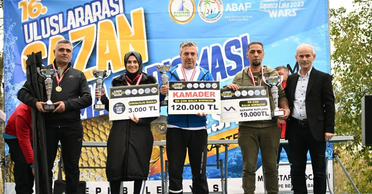 16.Uluslararası Sazan Balığı Tutma Yarışması" düzenlenen törende Kocaeli Büyükşehir Belediyesi Başkan Vekili Mustafa Soydabaş, 14.080 kg ile en çok balık birincisi Emin Korkmaz, Özey Düvenci, Serkan İşgören ve Abdullah Korkmaz'dan Carp Tutsal takımına, 4.430 kilo ile en çok balık ikincisi Gökhan Coşkun, Şenol Aydın ve Rıdvan Dinç'tan oluşan KASOBDER Takımına ödüllerini Kartepe Belediye Başkanı Av.M.Mustafa Kocaman, 2.900 kilo ile en çok balık üçüncüsü Koral Karaosmanoğlu, Uğur Menteş, Mutlu Yılmaz ve Mustafa Berse'den oluşan MYC Carptm 2 takımına ödüllerini Kent Konseyi Başkanı Ali Korkmaz tarafından verildi.