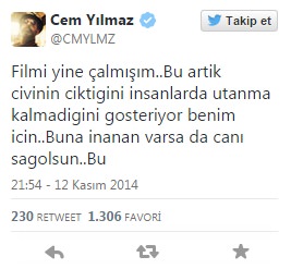 Kişisel Twitter hesabından açıklama yapan ünlü şovmen Cem Yılmaz, "Buna inanan varsa da canı sağolsun. Beni oyuncak gibi kullanmak istiyorsunuz sizi anlıyorum... Varın oynayın dilediğiniz gibi. Film yapmak ne kolay ne ciddiyetsiz iş bazısına. Teşekkür ederim...." ifadelerini kullandı.