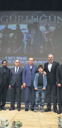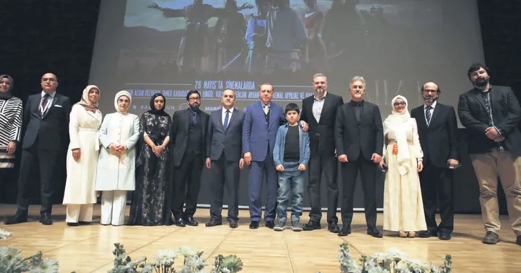 Cumhurbaşkanı Erdoğan ve eşi Emine Erdoğan, filmin gösteriminin ardından yapımcı ve yönetmenle birlikte fotoğraf çekimine katıldı.