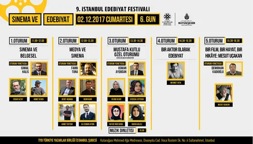"Sinema ve Edebiyat" temalı 9. İstanbul Edebiyat Festivali'nin bu yılki vedası zengin içeriğine yakışır bir program ve ödül töreni ile gerçekleşecek. TYB İstanbul Şube Başkanı Mahmut Bıyıklı'nın yöneteceği ve festivalin Onur Konuğu Semih Kaplanoğlu'nun konuşacağı özel programın ardından Göksel Baktagir konseriyle açılışı yapılacak Ödül Töreni'ne geçilecek.