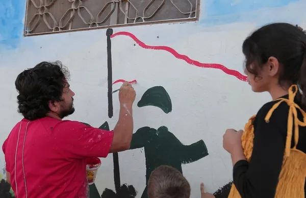 Binniş ilçesinde yaşayan 47 yaşındaki Aziz Esmer, İdlib'de Esed rejiminin saldırılarında yıkılan binaların duvarlarına resim çiziyor.