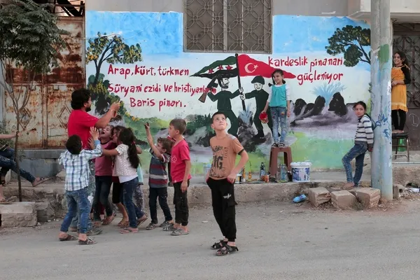 Grafitide, "Kardeşlik pınarı güçleniyor", "Arap, Kürt, Türkmen, Süryani, Ezidi ve Hristiyanların Barış Pınar'ı" yazılı ifadeler yer aldı.