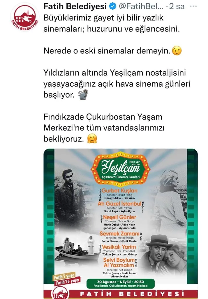 Açık hava sinama günlerinin programını paylaşan Fatih Belediyesi, vatandaşlara sosyal medyadan davette bulunarak, "Büyüklerimiz gayet iyi bilir yazlık sinemaları; huzurunu ve eğlencesini. Nerede o eski sinemalar demeyin. Yıldızların altında Yeşilçam nostaljisini yaşayacağınız açıkhava sinema günleri başlıyor. Fındıkzade Çukurbostan Yaşam Merkezi'ne tüm vatandaşlarımızı bekliyoruz" ifadelerini kullandı.