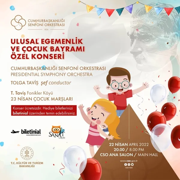 Cumhurbaşkanlığı Senfoni Orkestrası, Ulu Önder Mustafa Kemal Atatürk'ün tüm dünya çocuklarına armağanı 23 Nisan Ulusal Egemenlik ve Çocuk Bayramı'nı özel bir konserle kutlayacak. 22 Nisan Cuma akşamı CSO ADA Ankara Ana Salon'da gerçekleşecek konserde genç besteci ve orkestra şefi Tolga Taviş'in çocuklar için bestelediği "Fonikler Köyü" isimli eseri ve 23 Nisan'a yönelik çocuk marşları seslendirilecek. İzleyiciye 360 derecelik bir izleme deneyimi sunan CSO Ana Salon'da gerçekleşecek konser, CSO ADA ANKARA'nın teknik altyapısıyla eş zamanlı olarak TRT3'ten de dinlenebilecek.
