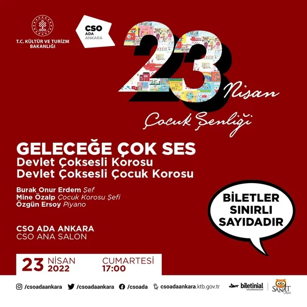 Şef Burak Onur Erdem yönetimindeki Devlet Çoksesli Korosu ve Mine Özalp yönetimindeki Devlet Çoksesli Çocuk Korosu, 23 Nisan coşkusunu "Birlikte Söyle: Geleceğe Çok Ses" başlıklı konserle yaşatacak. Özgün Ersoy'un piyano ile eşlik edeceği konserde 7 kardeş okul, Devlet Çoksesli Çocuk Korosu ve Devlet Çoksesli Korosu bir araya gelerek; sayısı 600'ü bulan katılımcıyla beraber şarkılar söyleyecek. Çocuklara yönelik etkinlikler ile başlayacak olan konser, 23 Nisan Cumartesi günü CSO gerçekleştirilecek.