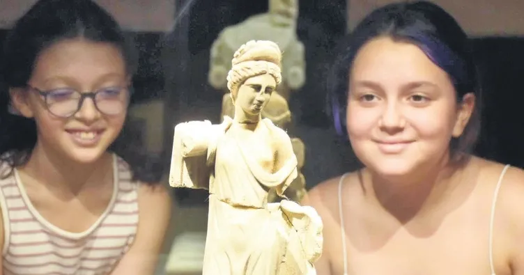 Roma dönemine ait 2 bin yıllık diğer heykelcik ise 35 santimetre ve grimsi beyaz mermerden yapılmış. Yanında ayrıca küçük kanatlı erkek figürü bulunan heykelciğin de kolları ile burnu kırık, üzerindeki kalker tabakası da yer yer dökülmüş. İzmir Müze Müdürlüğü Uzmanı Elvan Tural, "Bu eserler, günlük hayatta değil, ibadetle ilgili, öteki dünyada güzelliği ve bereketi temsil etmesi için kullanılabiliyor" dedi.