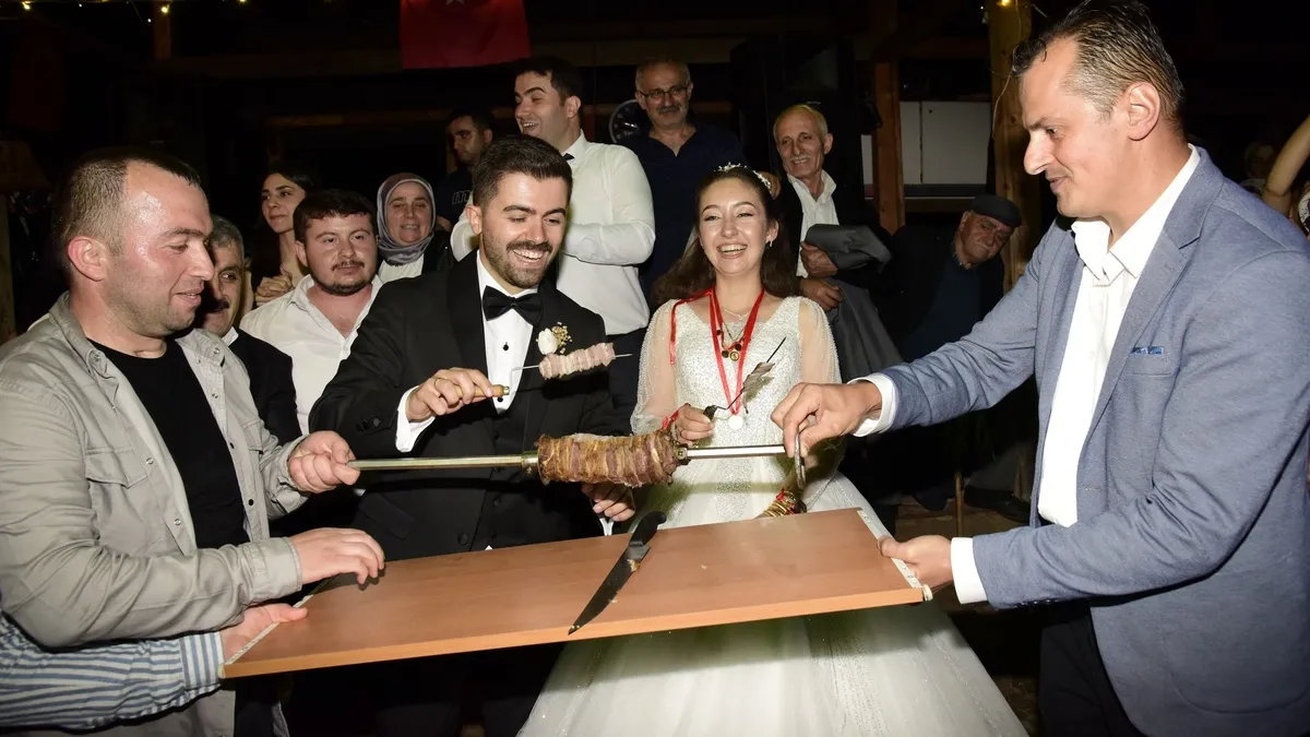 Düğünlerde birkaç katlı olup gelin ve damadın kestiği ve daha sonra ilk dilimin tadına kendilerinin baktığı basta yerine bu kez döner gelince gelinle damat ne yapacağını şaşırdı. Bıçağı alan damat döneri çağ şeklinde keserek geline ikram etti. Davetlilerin şaşkın bakışlarıyla gerçekleşen organizasyonda gelin ve damat gülmekten kendini alamadı.