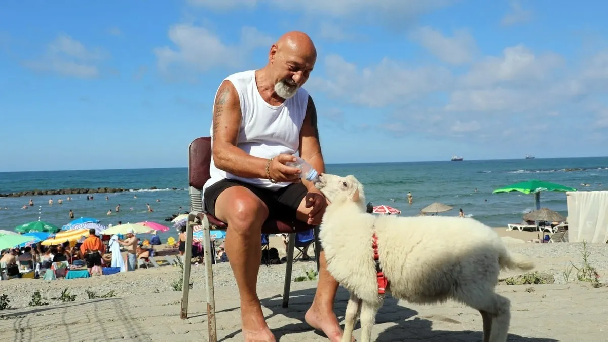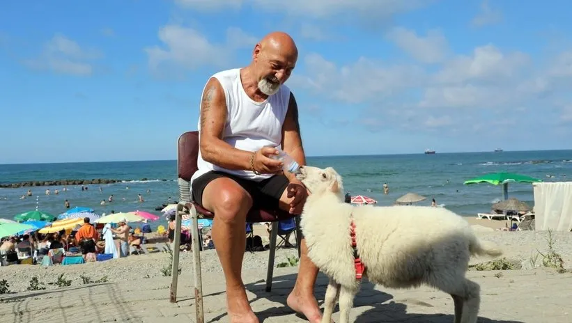 Peşinden ayırmadığı kuzusu ile denize gitti: Plajda gözler onlara çevrildi | Video