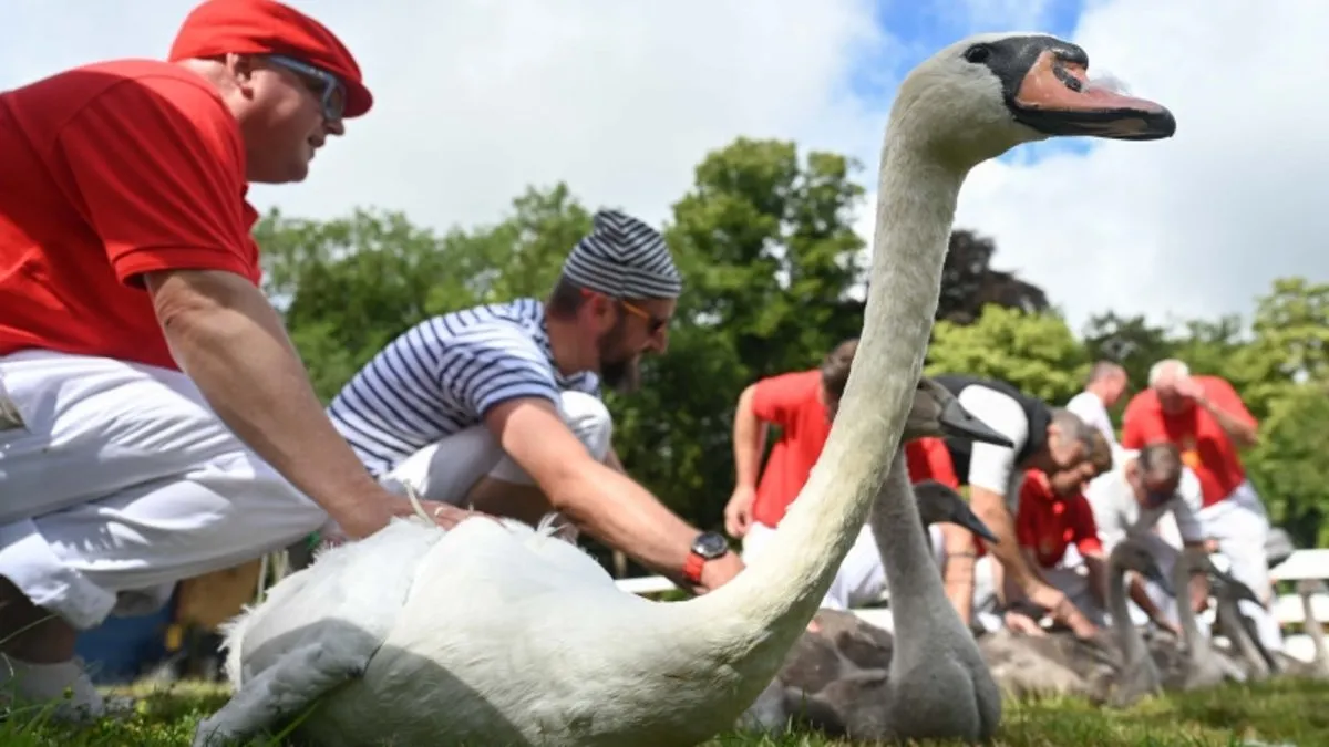 "Kuğu kaldırma" olarak bilinen bu tarihi işlem sırasında yavru kuğuların sağlık durumu, boyları ve kiloları da kontrol ediliyor. Sayılan kuğuların ayaklarındaki perdelere, sayıldıklarını gösteren bir işaret takılıyor.