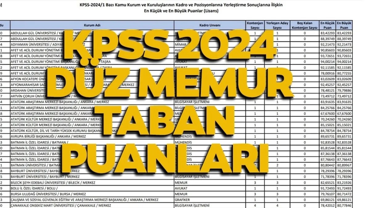 2024 yılı Kamu Personeli Seçme Sınavı (KPSS) lisans, ön lisans ve ortaöğretim sınavlarının sonuçları açıklandı. Kamu kurum ve kuruluşlarında memur olmak isteyen binlerce aday sonuçların ardından KPSS düz memur atama puanlarını araştırıyor. Bu noktada düşük KPSS puanı ile alım yapan memurlukları öğrenmek isteyen adaylar için 50-55-60-65-70 puanla alım yapan memurluklar listelendi. Peki, 2024 KPSS düz memur atama taban puanları açıklandı mı, hangi puan türlerine göre atama yapılacak? İşte en düşük ve en yüksek düz memur atama puanları ve kontenjanları görüntüleme ekranı...