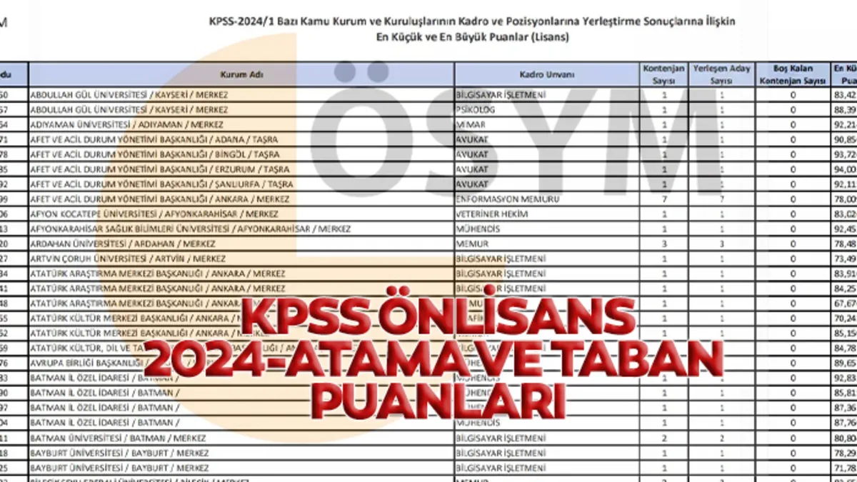 KPSS 2024/1 Bazı Kurum ve Kuruluşların Kadro ve Pozisyonlarına Yerleştirme Sonuçlarına İlişkin en küçük ve en yüksek puanlar ÖSYM tarafından erişime açılmıştı.