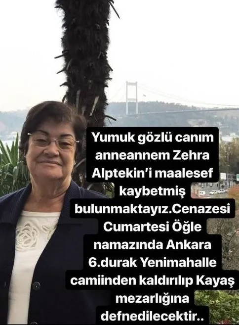 Ünlü oyuncu acı haberi sosyal medya hesabında takipçileri ile paylaştı. "Yumuk gözlü canım anneannem Zehra Alptekin'i maalesef kaybetmiş bulunmaktayız. Cenazesi cumartesi öğle namazında Ankara 6.Durak Yenimahalle Camii'nden kaldırılıp Kayaş Mezarlığı'na defnedilecektir..."
