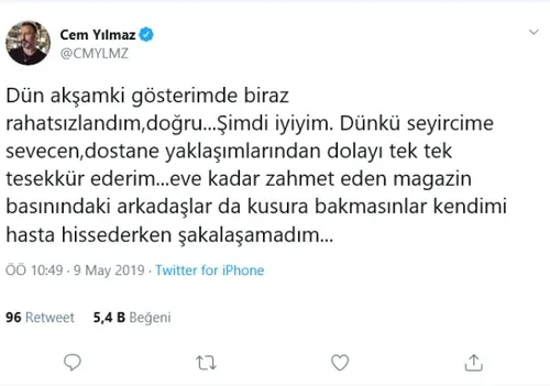 Hayranlarını korkutan Cem Yılmaz sosyal medya hesabında yaptığı açıklamayla yüreklere su serpti. Yılmaz, "Dün akşamki gösterimde biraz rahatsızlandım, doğru. Şimdi iyiyim. Dünkü seyircime sevecen, dostane yaklaşımlarından dolayı tek tek tesekkür ederim. Eve kadar zahmet eden magazin basınındaki arkadaşlar da kusura bakmasınlar kendimi hasta hissederken şakalaşamadım." açıklama yaptı.