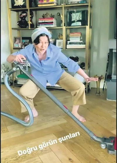 Spor yerine evi süpürüp sildiğini belirten oyuncu, "Bugünkü sporumuzu bel, kol, bacak, kalça kaslarını çalıştıran aletlerle yapacağız" dedi.