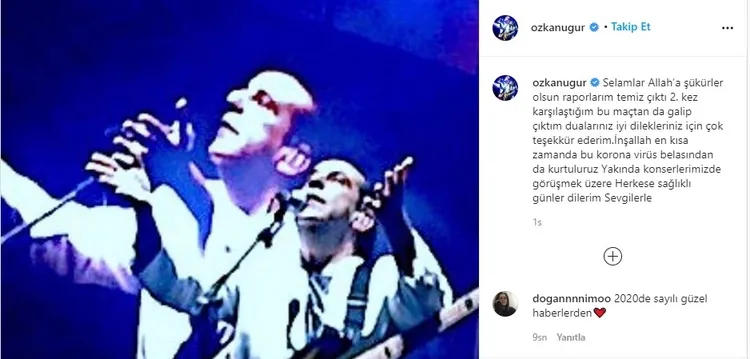 "2. kez karşılaştığım bu maçtan da galip çıktım. Dualarınız, iyi dilekleriniz için çok teşekkür ederim. İnşallah en kısa zamanda bu korona virüs belasından da kurtuluruz. Yakında konserlerimizde görüşmek üzere. Herkese sağlıklı günler dilerim Sevgilerle."
