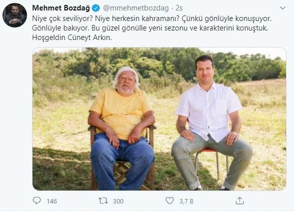 Gönlüyle bakıyor. Bu güzel gönülle yeni sezonu ve karakterini konuştuk. Hoş geldin Cüneyt Arkın." ifadelerini kullandı.
