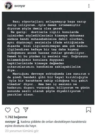 Yaşar, "Bazı röportajları anlayamayıp başa sarıp izliyorum. 'Öyle demek istememiştir' diyorum. Ama günün sonunda sesli olarak 'Yazıklar olsun!" diyebiliyorum" deyip ekledi: "Kadına şiddete de, onları destekleyen karaktersiz eşine dostuna da hayır."