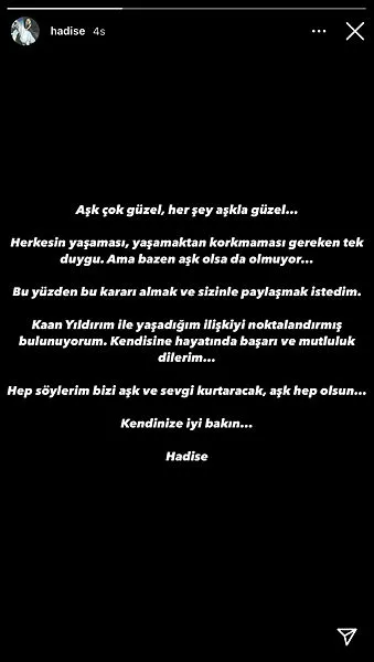 Sosyal medya hesabından ilişkisinin bittiğini açıklayan Hadise, "Aşk çok güzel, her şey aşkla güzel... Herkesin yaşaması, yaşamaktan korkmaması gereken tek duygu. Ama bazen aşk olsa da olmuyor...Bu yüzden bu kararı almak ve sizinle paylaşmak istedim. Kaan Yıldırım ile yaşadığım ilişkiyi noktalandırmış bulunuyorum. Kendisine hayatında başarı ve mutluluk dilerim..." ifadelerine yer verdi.