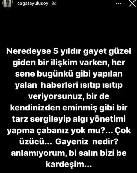 Kulislerde dolaşan dedikoduları kesin bir dille yalanlayan Çağatay Ulusoy, "Neredeyse 5 yıldır gayet güzel giden bir ilişkim varken, her sene bugünkü gibi yapılan yalan haberleri ısıtıp ısıyıp veriyorsunuz, bir de kendinizden eminmiş gibi bir tarz sergileyip algı yönetimi çabanız yok mu?! Çok üzücü...Gayeniz nedir? Anlamıyorum bir salın bizi be kardeşim..." ifadelerini kullandı.
