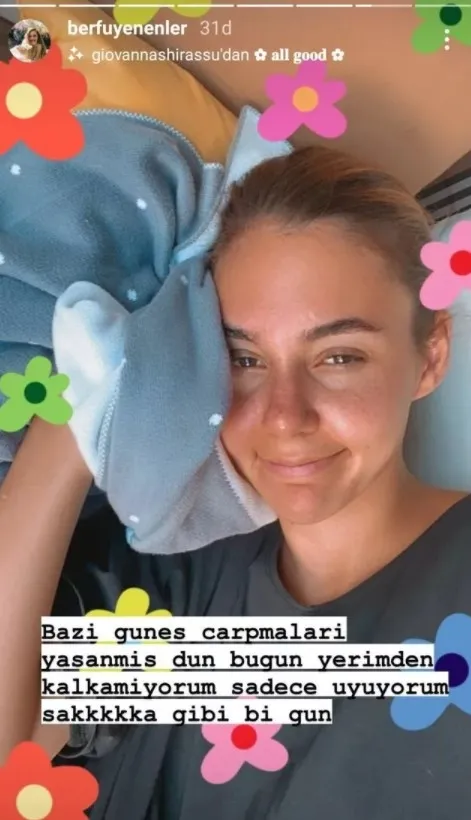 Instagram'ın hikaye kısmından bir fotoğrafını paylaşan Berfu Yenenler, paylaşımının hemen altına, "Bazı güneş çarpmaları yaşanmış dün... Bugün yerimden kalkamıyorum, sadece uyuyorum. Şaka gibi bir gün" diye yazdı. Yenenler daha sonra, "Biraz kumru yiyip, düzelmeye çalışalım" notunu düştü.