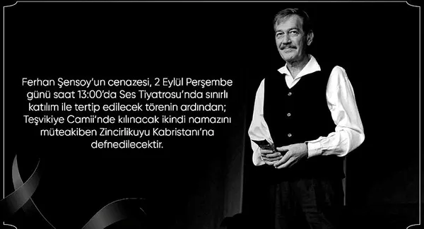 Usta tiyatrocu ve sinemacı Ferhan Şensoy kızı Derya Şensoy babasının cenaze töreni ile ilgili yaptığı açıklamada, "Babam Ferhan Şensoy'un Cenazesi 2 Eylül Perşembe günü saat 13.00'da SES Tiyatrosunda sınırlı katılım ile tertip edilecek törenin ardından Teşvikiye Camii'nde kılınacak ikindi namazından sonra kılınacak cenaze namazı sonrası Zincirlikuyu kabristanında defnedilecek" dedi.