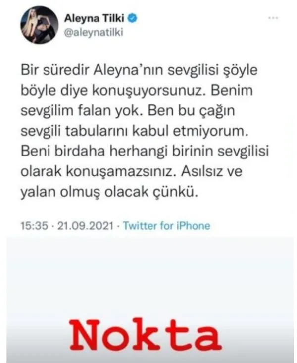 Ünlü şarkıcı, "Bir süredir Aleyna'nın sevgilisi şöyle böyle diye konuşuyorsunuz. Benim sevgilim falan yok. Ben bu çağın sevgili tabularını kabul etmiyorum. Beni bir daha herhangi birinin sevgilisi olarak konuşamazsınız. Asılsız ve yalan olmuş olacak çünkü." Dedi.