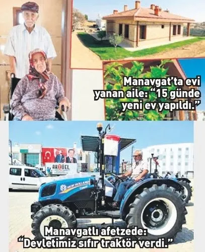 En son Manavgat'taki orman yangınlarında traktörleri kullanılmaz hale gelen 16 çiftçiye, yeni traktör verildi. 45 yaşındaki Mustafa Köse, "Benim traktörüm 77 modeldi, bu traktör 2021 model, devletimizden Allah razı olsun. Devletimiz bize sıfır traktör verdi" dedi. Bu yardıma da göstermelik, şov amaçlı diyenler olur mu acaba?