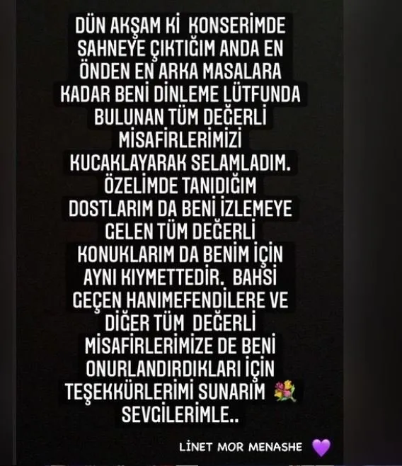 Belki gündemin üzerinden birkaç gün geçti ancak birkaç şey söylemeden geçmek istemedim. Aslı Şen, kız arkadaşlarıyla Linet'i en ön masada dinlemeye gidiyor. Sonrasında o da ne! Linet'in fotoğrafının üstüne çarpı işareti koyan Aslı Şen, "Yıllardır canlı müzik mekanlarında birçok sanatçıyı dinlemeye giderim. Genelde de masam en öndedir. Adab-ı muaşeret gereği, sanatçı özellikle ön masalara gözünün ucuyla da olsa saygıdan bir selam verir" diyerek isyan etti...