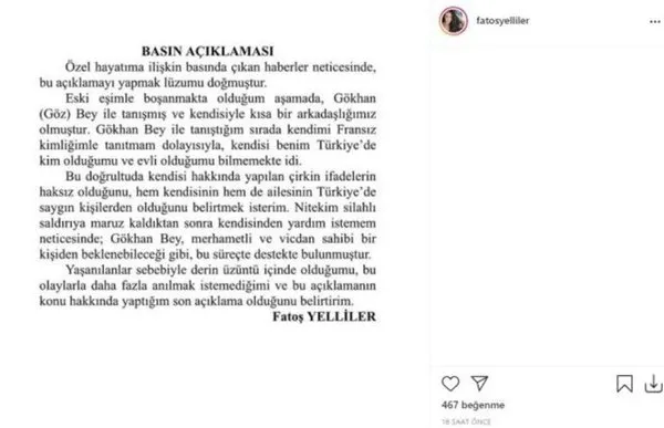 Bu gelişmelerin ardından Fatoş Yelliler, "Özel hayatıma ilişkin basında çıkan haberler neticesinde bu açıklamayı yapmak lüzumu doğmuştur" diyerek, sosyal medya hesabından açıklama yapmıştı.