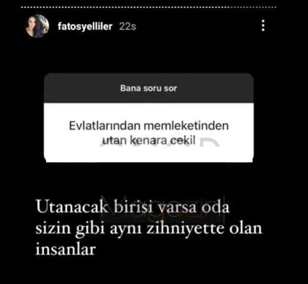 Bugün ise Fatoş Yelliler, sosyal medyadan kendisine yönlendirilen sorulara cevap verdi. Yelliler, "Evlatlarından ve memleketinden utan, kenara çekil" şeklinde yazılan mesaja, "Utanacak birisi varsa o da sizin gibi aynı zihniyette olan insanlar" şeklinde cevap verdi.
